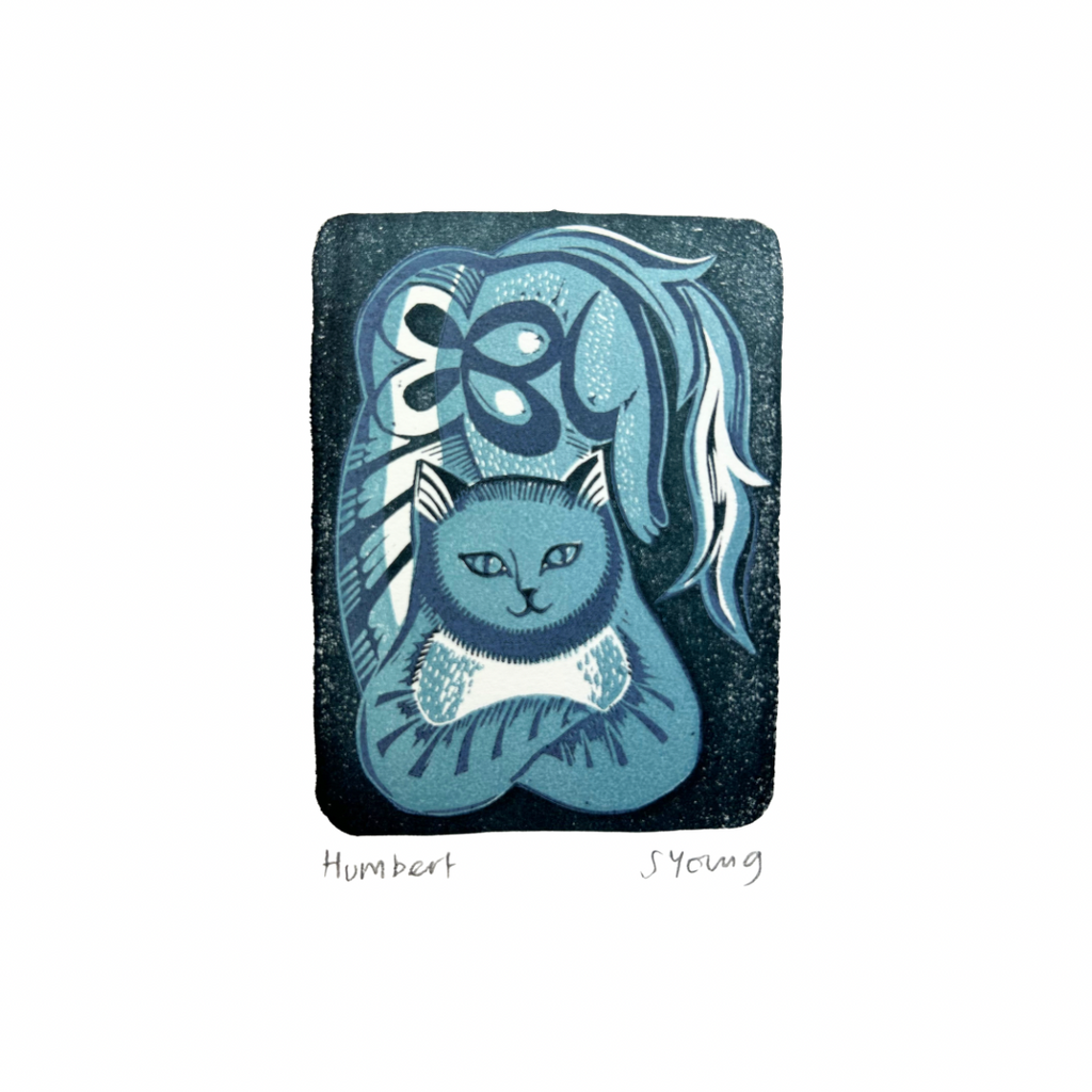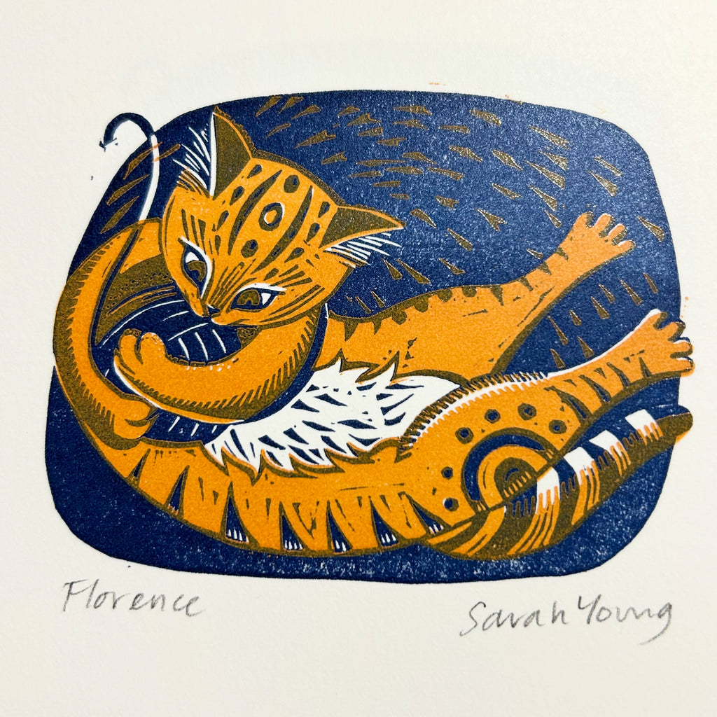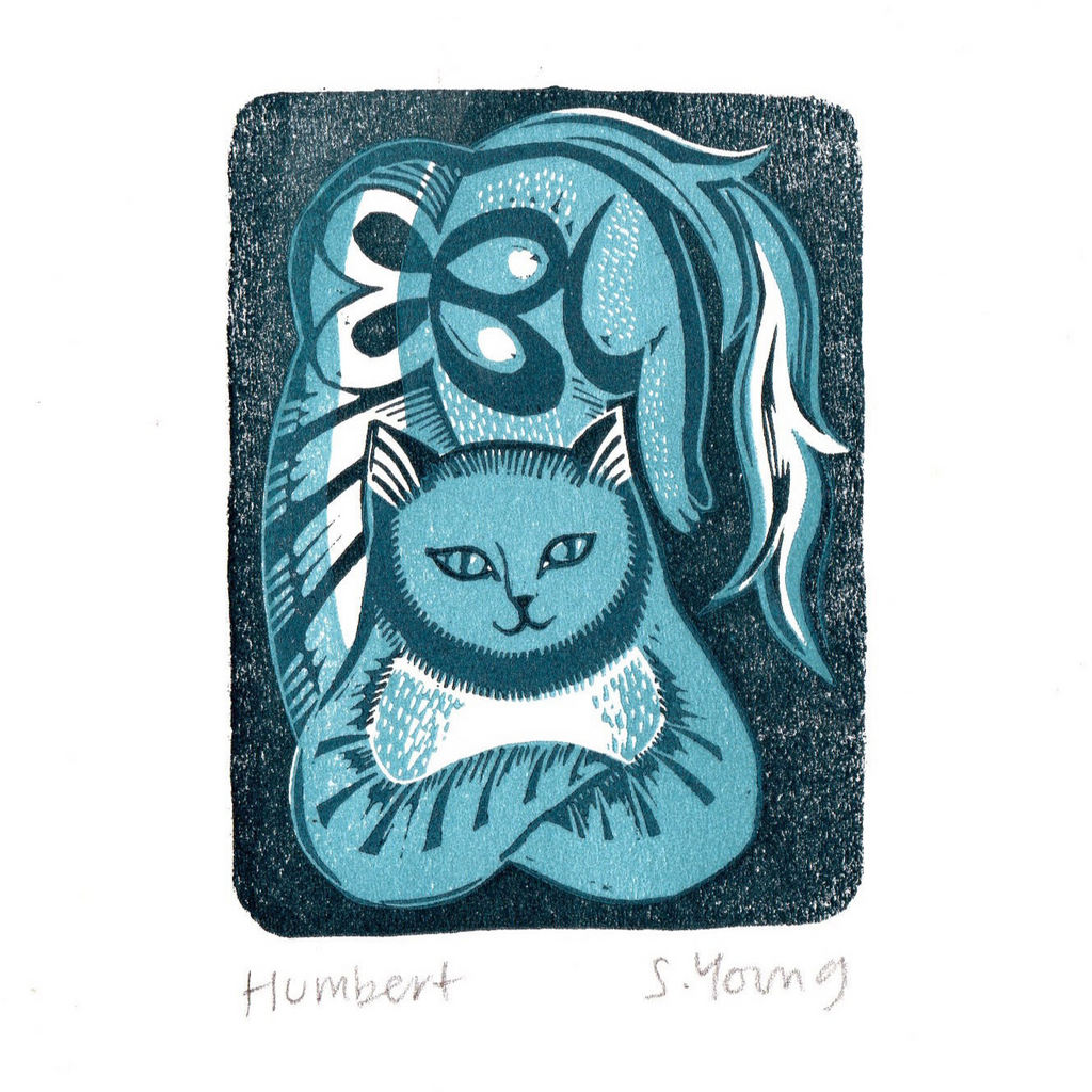 Humbert, Florence, Olwen and Morris are all original, hand printed Lino prints. They have been made with gouges and knives and printed on our little Adana press in our studio by the sea.