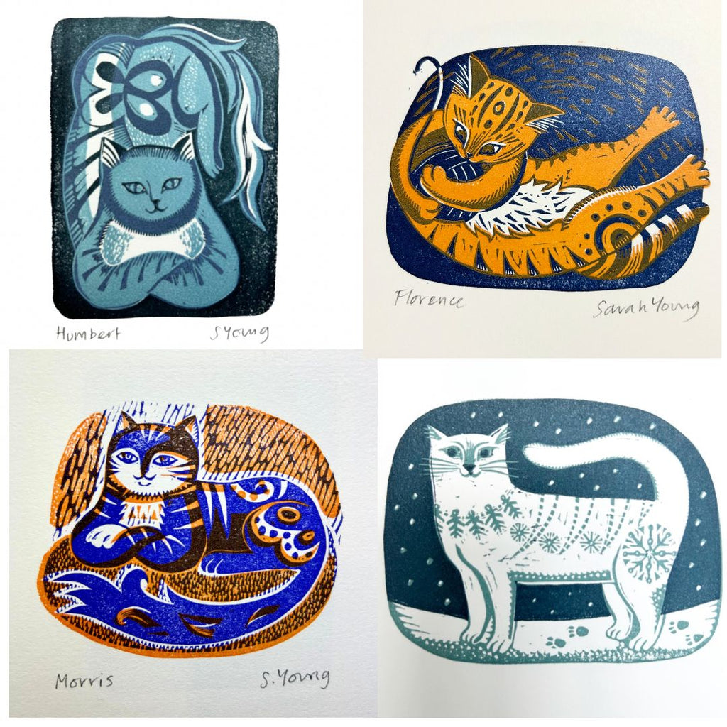 All 4 Cat Handprinted Linocut Prints -