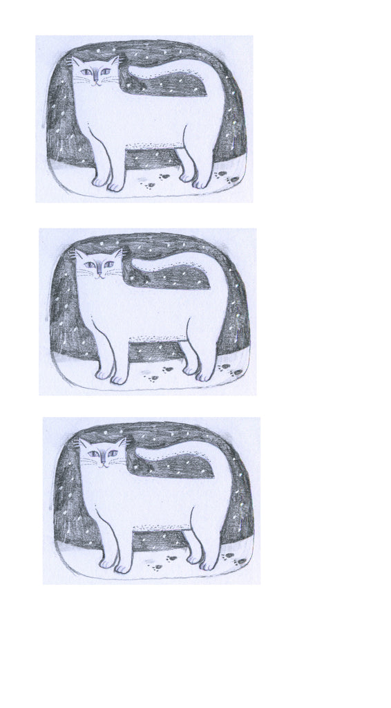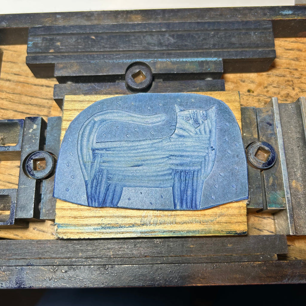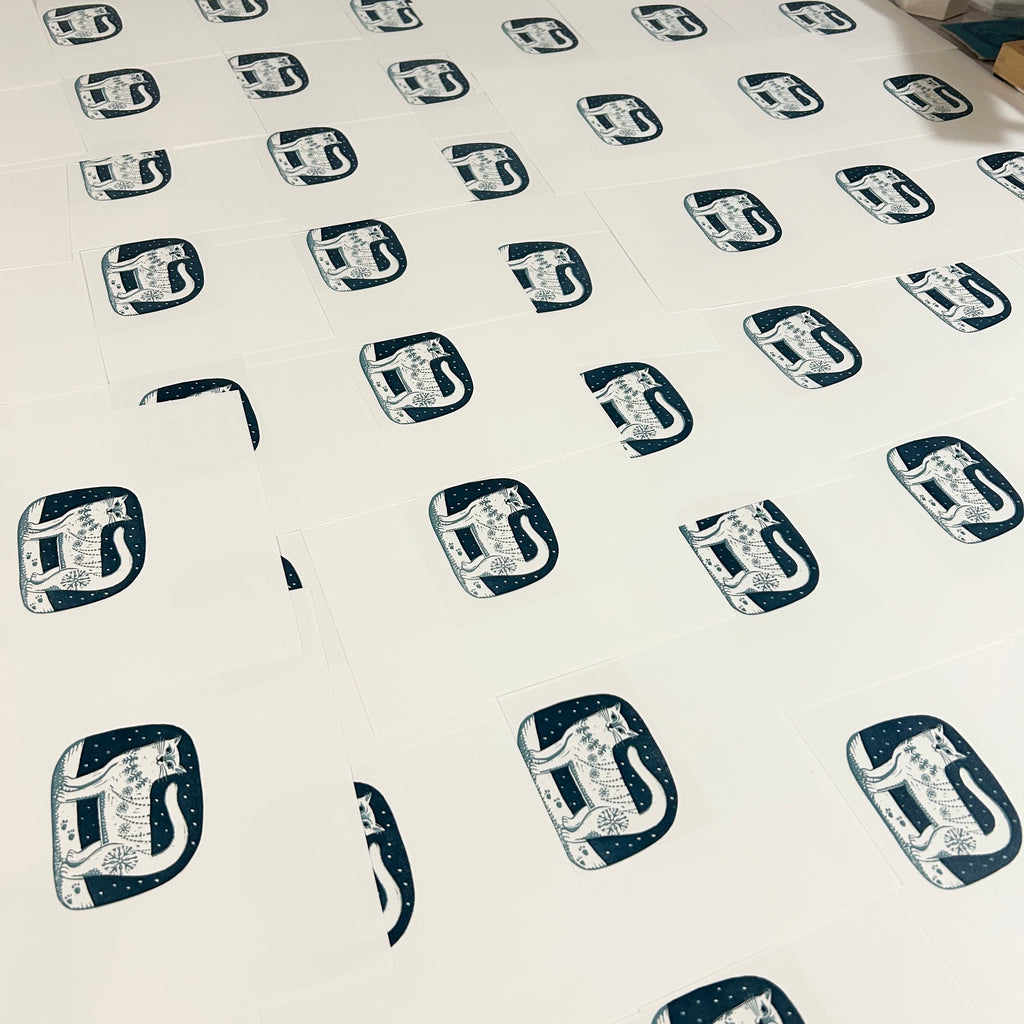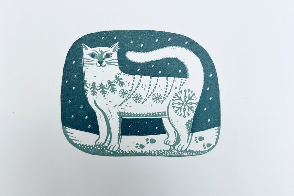 Olwen the cat is a Lino print. It has been cut with gouges and knives and printed on our little Adana press.