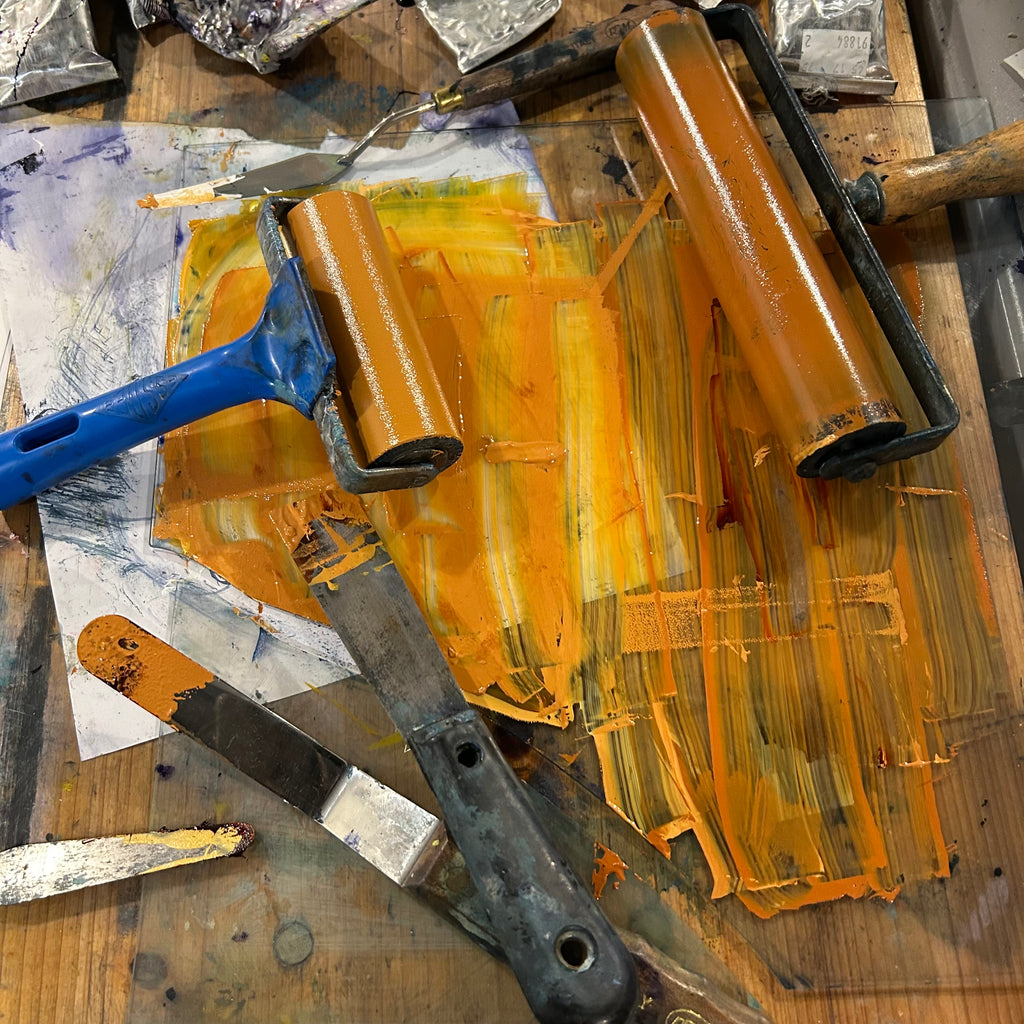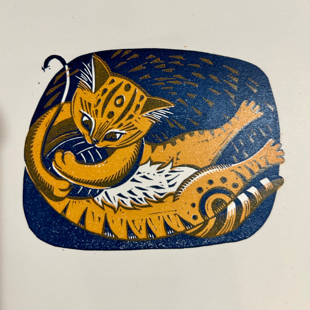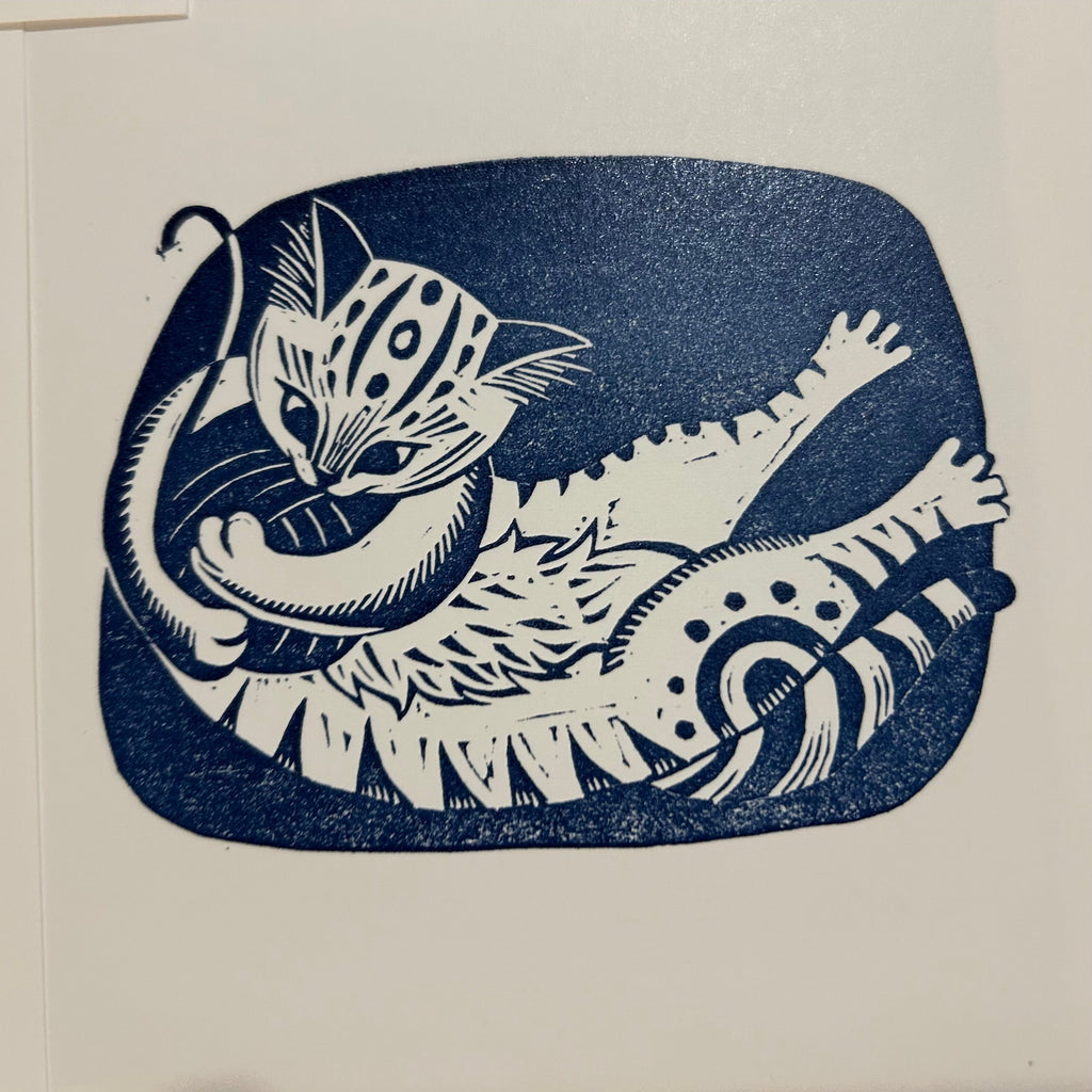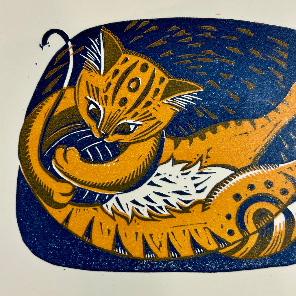 Florence the cat is a Lino print. It has been cut with gouges and knives and printed on our little Adana press.