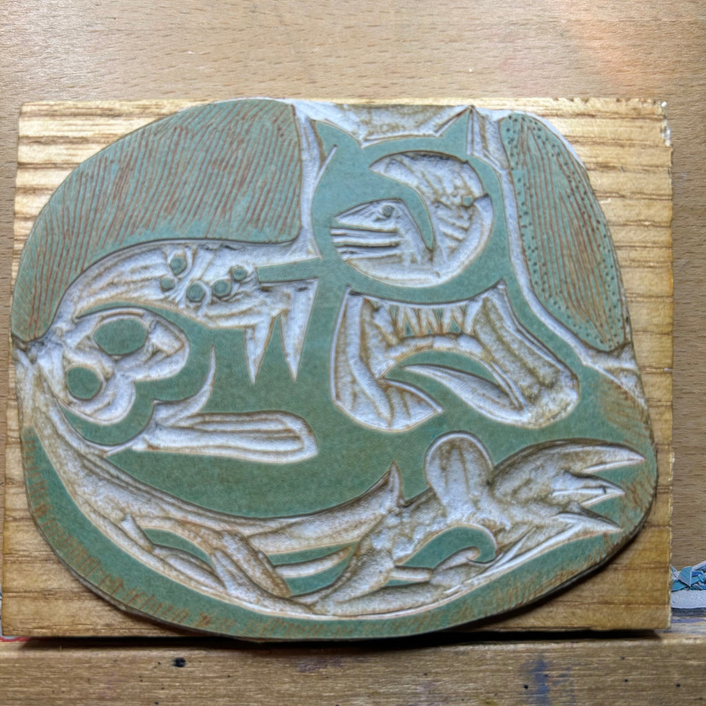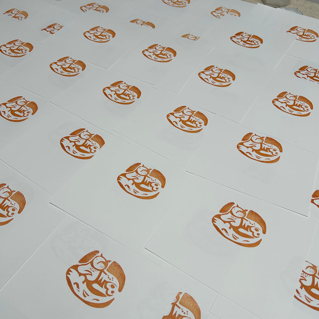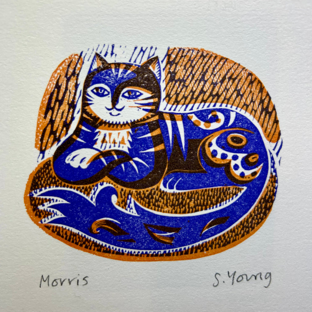 Morris the cat is a Lino print. It has been cut with gouges and knives and printed on our little Adana press.